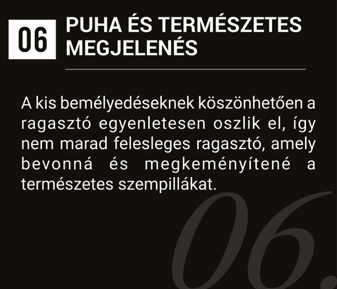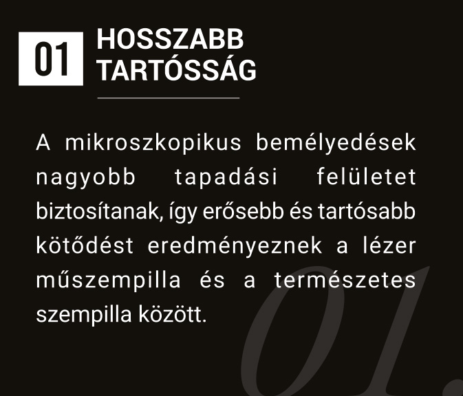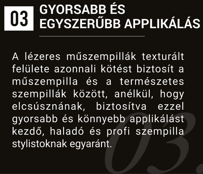 A fejlett technológiának köszönhetően a lézervágott műszempillák rugalmasabbak és tartósabbak, mint a normál műszempillák, továbbá sokkal természetesebben illeszkednek a saját pillákhoz. Ezen felül érdemes még megemlíteni, hogy a munkát is megkönnyítik: sosem volt még ilyen könnyű a tincsezés és az illesztés, mint a lézer szempillával!